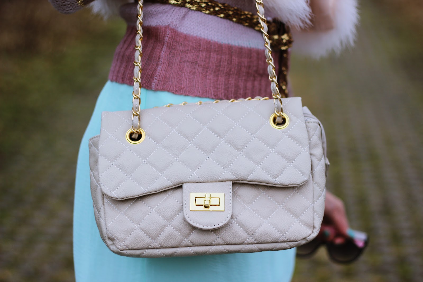 | What I was wearing: Flower: H&M Fur pink vest: Vintage Stripe pink nude sweater: New look Golden belt/wedges: Zara Mint skirt: zara Chanel look like bag Arafeel: Courtesy of www.arafeel.com |